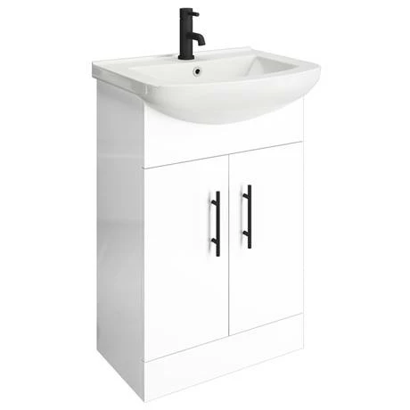 A 560mm wide high gloss white free standing vanity unit with a quality smooth ceramic basin top and matching WC unit with modern toilet, part of the Venice range of bathroom furniture. Features soft closing doors with modern matt black door handles. Provides generous storage space for your toiletries, helping to keep your bathroom clutter free.