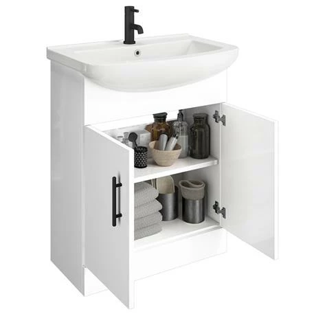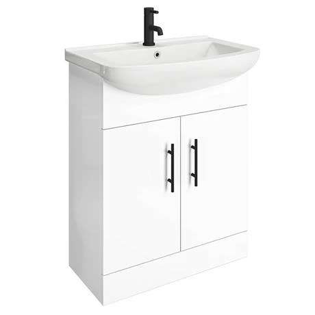 A 665mm wide high gloss white free standing vanity unit with a quality smooth ceramic basin top and matching WC unit with modern toilet, part of the Venice range of bathroom furniture. Features soft closing doors with modern matt black door handles. Provides generous storage space for your toiletries, helping to keep your bathroom clutter free.