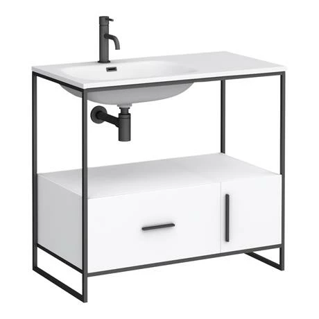 Features a contemporary 900mm wide free standing 1-drawer, 1-cupboard washstand, with a designer spacious offset matt white finish stone resin basin to complement the matt black washstand.