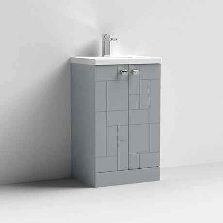 The Venice Abstract 500mm Grey 2-Door Floor Standing Vanity Unit features an eye-catching geometric design that will create a style statement in your bathroom. It has ample storage with soft-closing cupboard doors and an internal shelf to keep your toiletries organised. A ceramic basin slots perfectly on top and all pipework is neatly concealed within the unit. Manufactured from quality materials, this vanity unit comes fully assembled and is finished in grey satin.