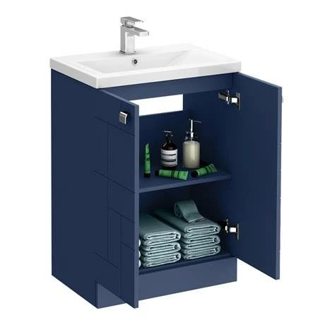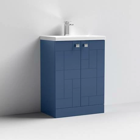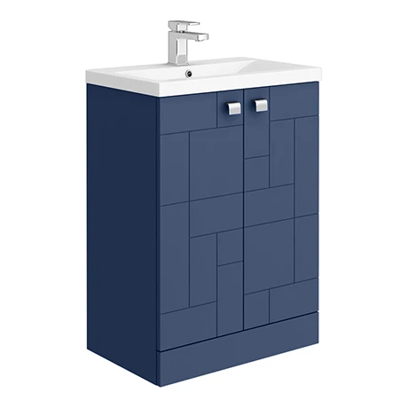 The Venice Abstract 600mm Blue 2-Door Floor Standing Vanity Unit features an eye-catching geometric design that will create a style statement in your bathroom. It has ample storage with soft-closing cupboard doors and an internal shelf to keep your toiletries organised. A ceramic basin slots perfectly on top and all pipework is neatly concealed within the unit. Manufactured from quality materials, this vanity unit comes fully assembled and is finished in blue satin.
