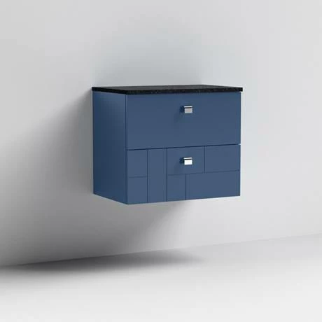 Venice Abstract 600mm Wall Hung Blue 2 Drawer Vanity Unit with Sparkling Black Quartz Effect Worktop & Chrome Square Drop Handles