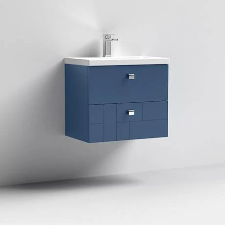 The Venice Abstract 600mm Blue 2-Drawer Wall Hung Vanity Unit features an eye-catching geometric design that will create a style statement in your bathroom. It has ample storage with two large soft-closing drawers to keep your toiletries organised. A ceramic basin slots perfectly on top and all pipework is neatly concealed within the unit. Manufactured from quality materials, this vanity unit comes fully assembled and is finished in blue satin.