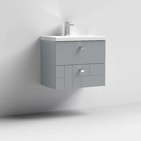 The Venice Abstract 600mm Grey 2-Drawer Wall Hung Vanity Unit features an eye-catching geometric design that will create a style statement in your bathroom. It has ample storage with two large soft-closing drawers to keep your toiletries organised. A ceramic basin slots perfectly on top and all pipework is neatly concealed within the unit. Manufactured from quality materials, this vanity unit comes fully assembled and is finished in grey satin.