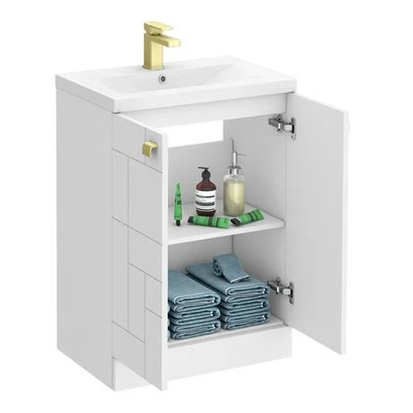 The Venice Abstract 600mm White 2-Door Floor Standing Vanity Unit with Brushed Brass Drop Handles features an eye-catching geometric design that will create a style statement in your bathroom. It has ample storage with soft-closing cupboard doors and an internal shelf to keep your toiletries organised. A ceramic basin slots perfectly on top and all pipework is neatly concealed within the unit. Manufactured from quality materials, this vanity unit comes fully assembled and is finished in white satin.