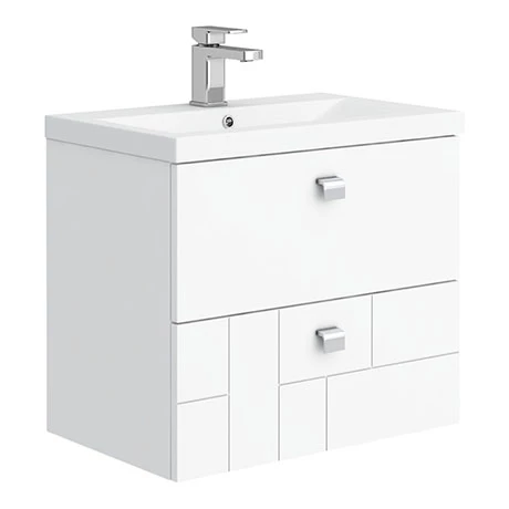 The Venice Abstract 600mm White 2-Drawer Wall Hung Vanity Unit features an eye-catching geometric design that will create a style statement in your bathroom. It has ample storage with two large soft-closing drawers to keep your toiletries organised. A ceramic basin slots perfectly on top and all pipework is neatly concealed within the unit. Manufactured from quality materials, this vanity unit comes fully assembled and is finished in white satin.