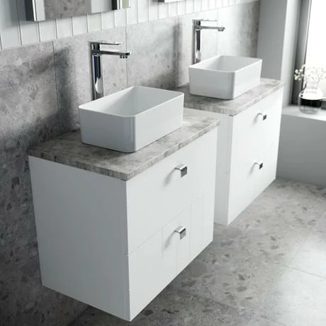 Venice Abstract 600mm Wall Hung White 2 Drawer Vanity Unit with Bellato Grey Concrete Effect Worktop & Chrome Square Drop Handles