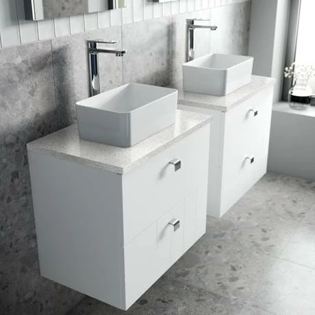Venice Abstract 600mm Wall Hung White 2 Drawer Vanity Unit with Sparkling White Quartz Effect Worktop & Chrome Square Drop Handles