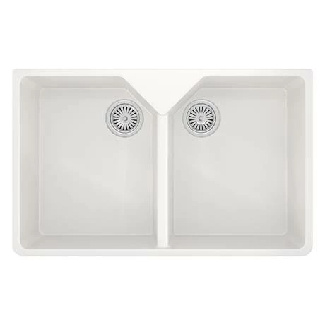 The Venice composite kitchen sink range are constructed from pressed material that is stain, scratch and impact resistant as well as being antibacterial. The sinks can withstand high heat temperatures and are easy to maintain and clean. This 2.0 bowl sink comes in a smooth gloss white finish and comes supplied with chrome basket strainer wastes.Â