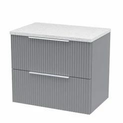 Venice Fluted 600mm Satin Grey Vanity Unit – Wall Hung 2 Drawer Unit with Sparkling White Quartz Effect Worktop & Chrome Handles