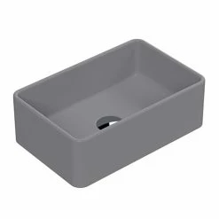 The Venice rectangular counter top basin features soft square lines and a modern minimalist design. Designed to be mounted to a worktop console or vanity unit, the basin is the perfect complement for a high rise tap or wall mounted mixer. Manufactured from vitreous china with a quality matt grey finish.