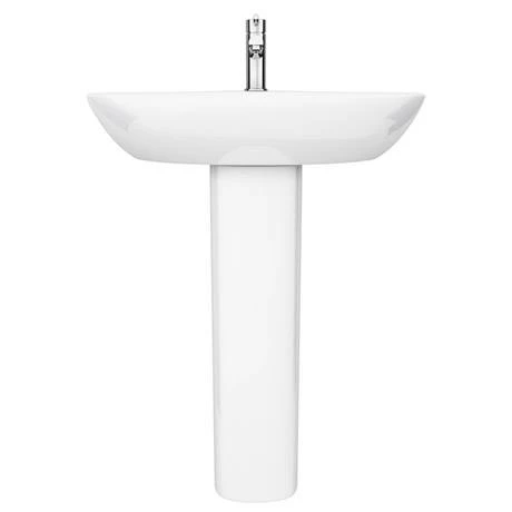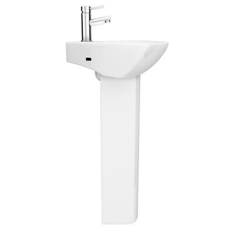 The modern Venice 1 tap hole corner basin and pedestal, it’s contemporary elegant soft lines and compact size make it ideal for smaller bathrooms and en-suites; made from high grade ceramic with a smooth cool white finish. Comes with a full pedestal.