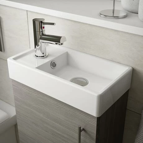 The Venice modern 400mm wide compact gloss grey cloakroom vanity unit suite features a quality gloss white glazed ceramic wash basin and a stylish short projection close coupled toilet with soft closing white toilet seat, it’s compact design is ideal for cloakrooms or smaller bathrooms where space is at a premium.